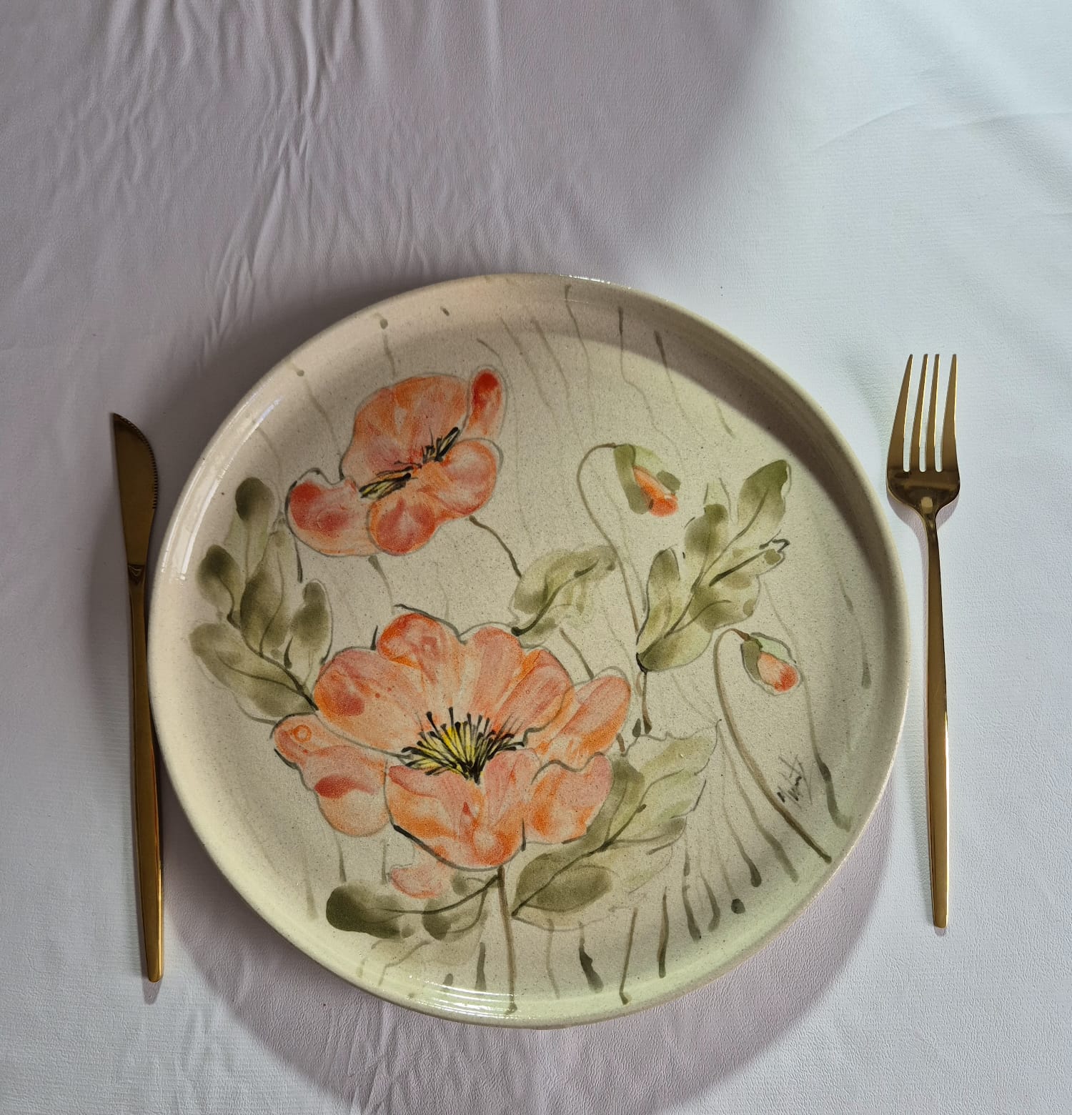 Um prato de Cerâmica feito à mão, delicado e cheio de poesia. A superfície translúcida do vidrado recebeu pintura em aquarela com motivos florais, criando nuances suaves de cor que se espalham de forma orgânica, tornando a peça única.
